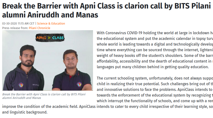 ApniClass, an iStart Rajasthan incubated start-up, is an online platform catering to the educational needs of vernacular school-going children. The education system is riddled with a lot of loopholes and shortcomings and we aim to address these by providing effective and efficient solutions. By creating affordable and accessible educational videos, Apniclass is trying to bridge the gap and helping vernacular medium students give a chance to compete and excel.